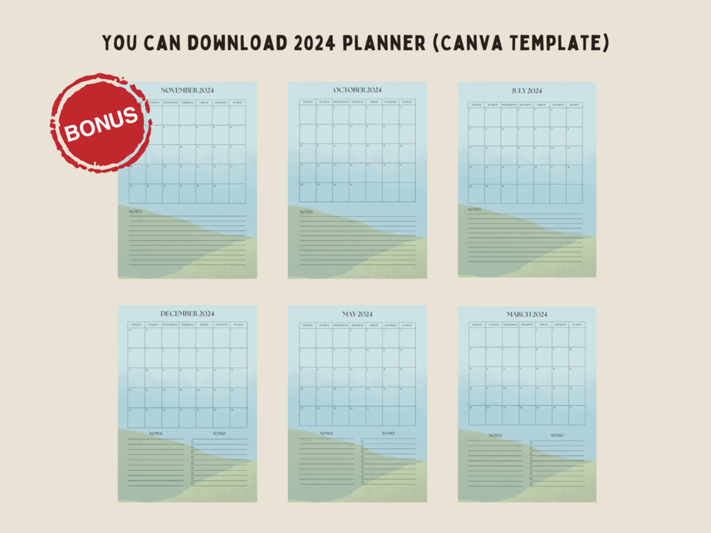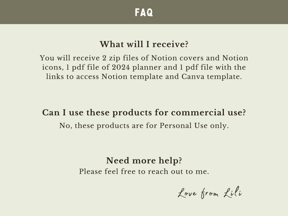 You will receive 2 zip files of Notion covers and Notion icons, 1 pdf file of 2024 planner and 1 pdf file with the links to access Notion template and Canva template.
